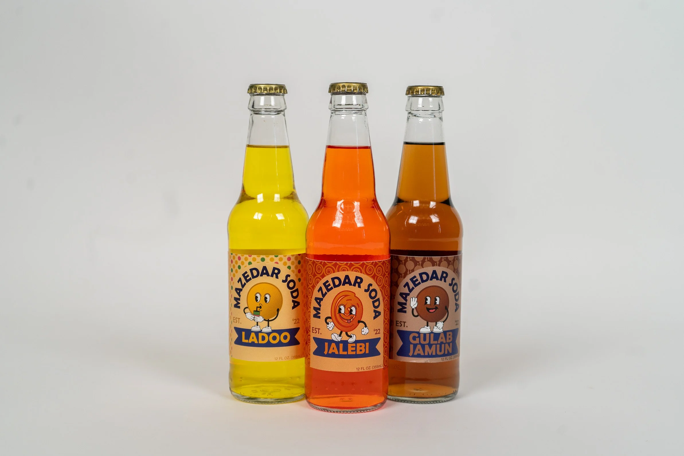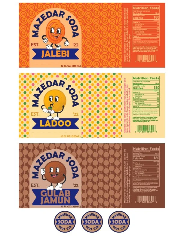 Mazedar Soda is a self-authored line of sodas based on popular South Asian sweets. Each bottle features a cartoon character illustration as well as a color palette and pattern based on the corresponding dessert.
